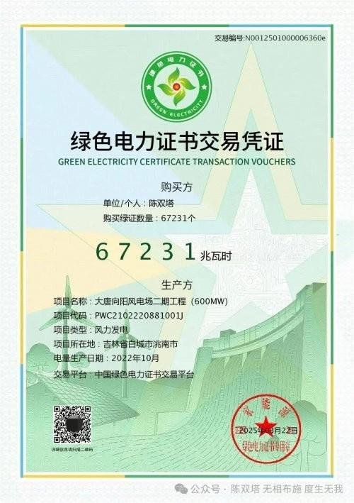 陈双塔绿电(绿证)消费629.19万张,绿色电力62.919亿度清洁能源